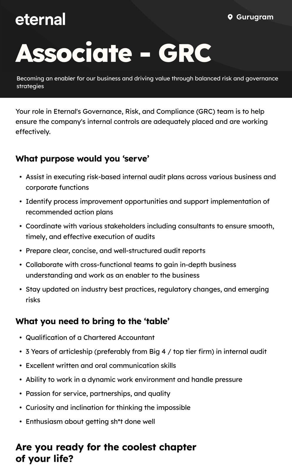 Eternal is hiring recently qualified Chartered Accountants to join our Governance, Risk, and Compliance (GRC) team based in Gurugram.