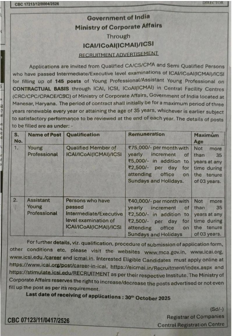 Applications are invited from Qualified CA/CS/CMA and Semi Qualified persons who have passed Intermediate/Executive level examinations for filling up of 145 posts of Young Professional/Assistant Young Professional on CONTRACTUAL BASIS through ICAI, ICoAI (ICMAI), ICSI in Central Facility Centres (CRC /C-PACE/ CSC/ CPC) of Ministry of Corporate Affairs, Government of India, located at Manesar, Haryana.